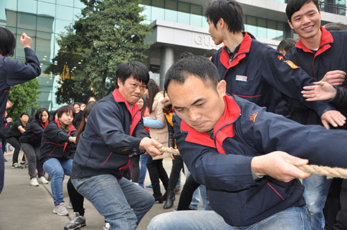 拔河比賽每條隊伍由7名女員工、3名男員工組成,首兩輪采用淘汰制,最后一輪則是循環(huán)賽,直至賽出冠、亞、季軍。比賽當(dāng)天,陽光明媚,賽場的氣氛格外熱烈。