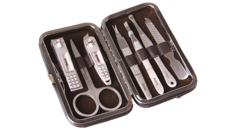 包裝規(guī)格:110mm*67mm*25mm 單套重量:131.6g 材質(zhì):PU+430不銹鋼 配件:RMT625E指甲鉗、美容剪、斜口指甲鉗、指甲銼、耳挖、死皮刀、眉夾